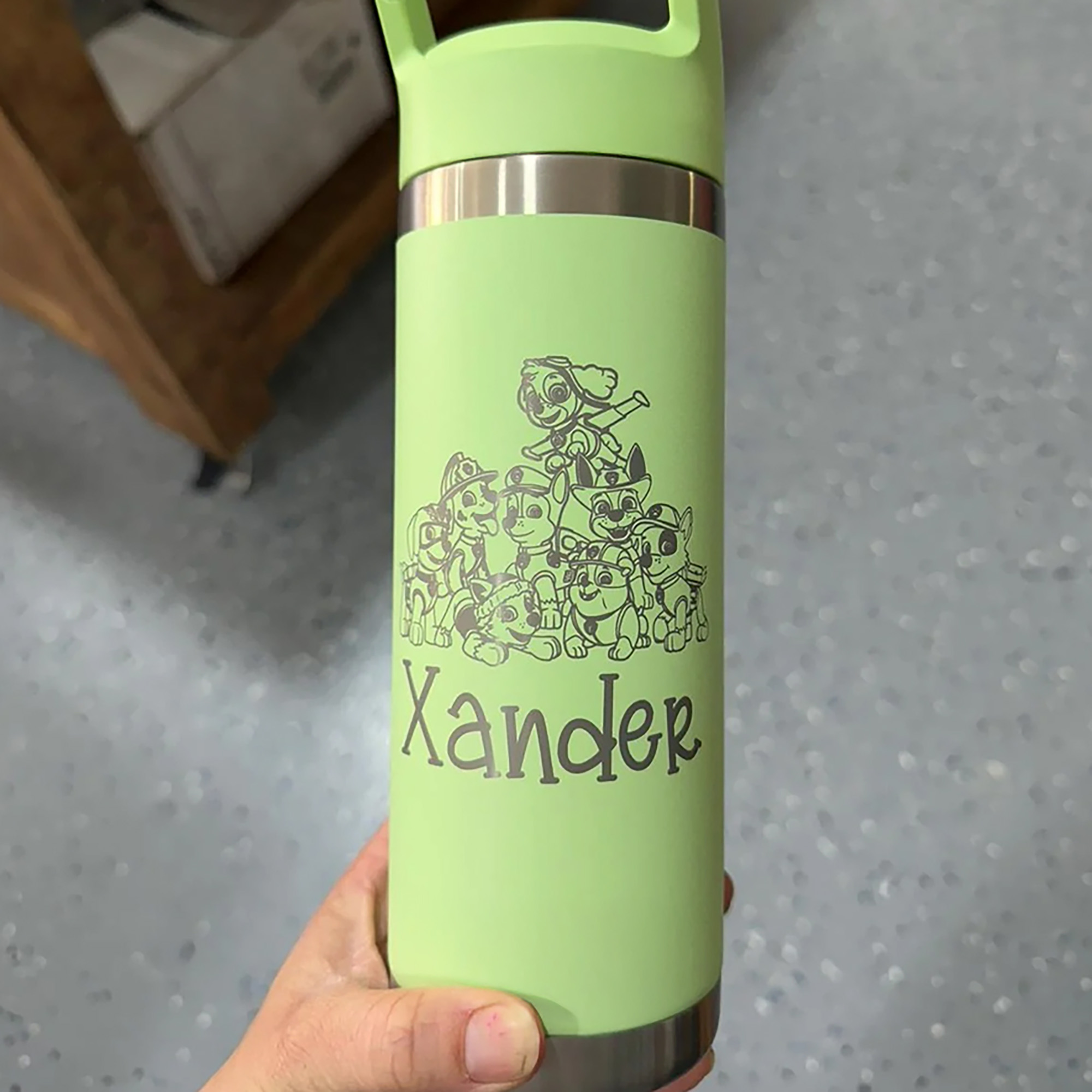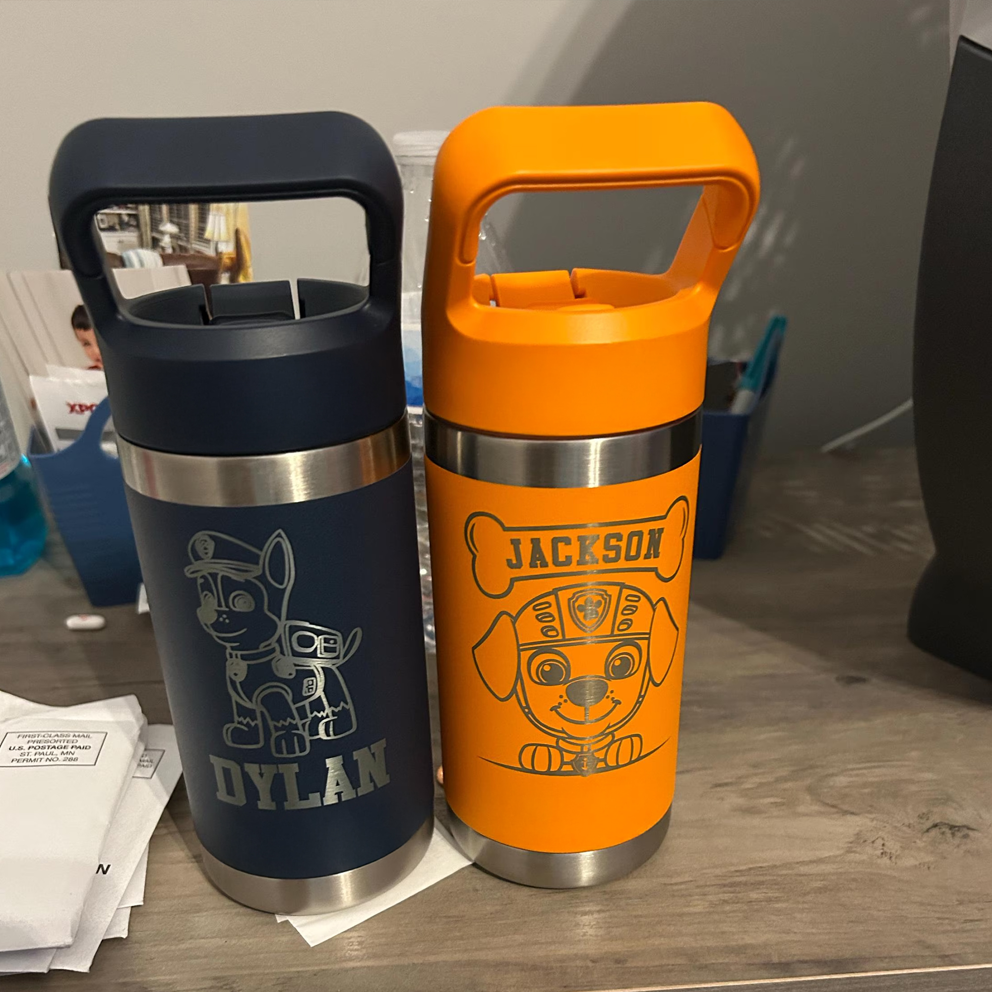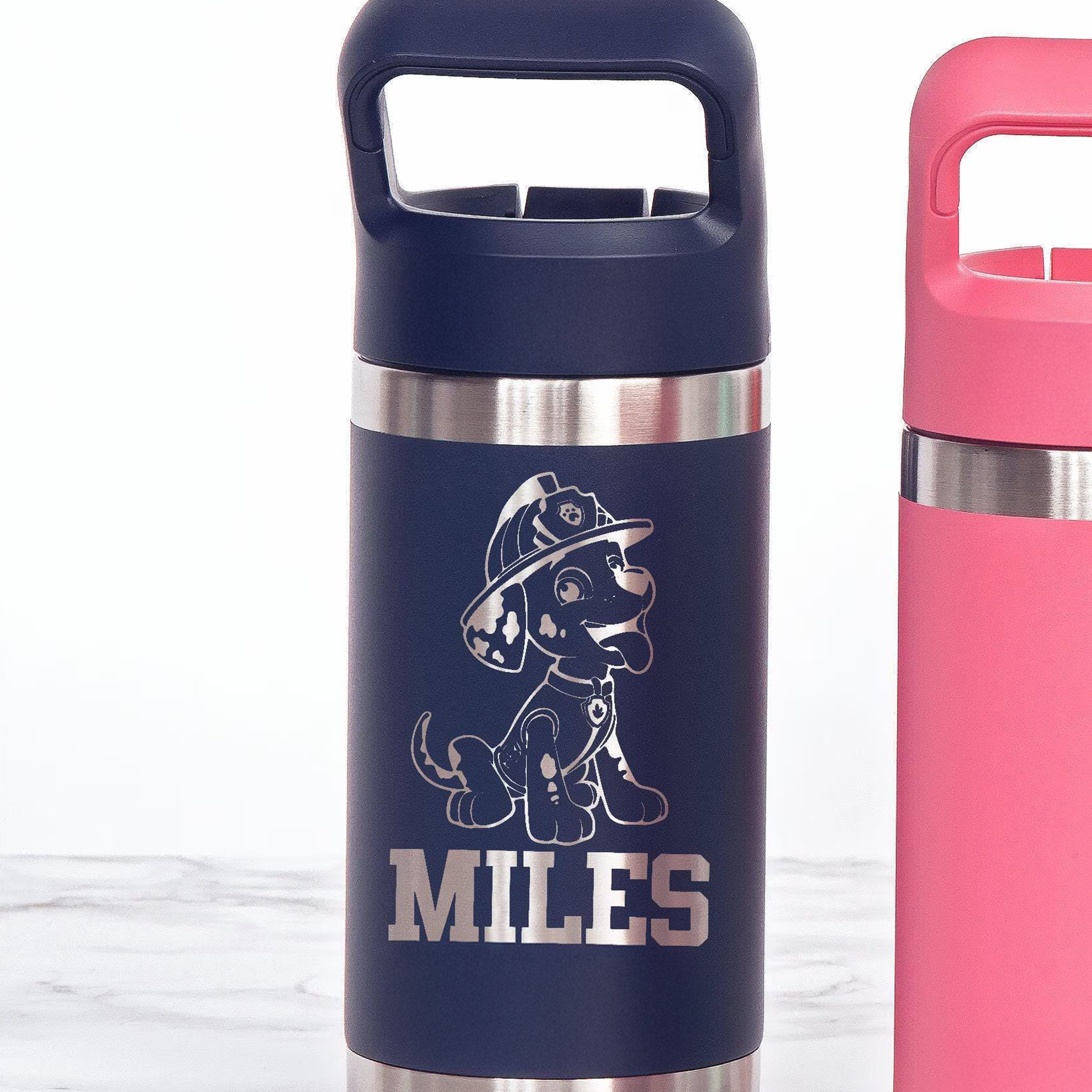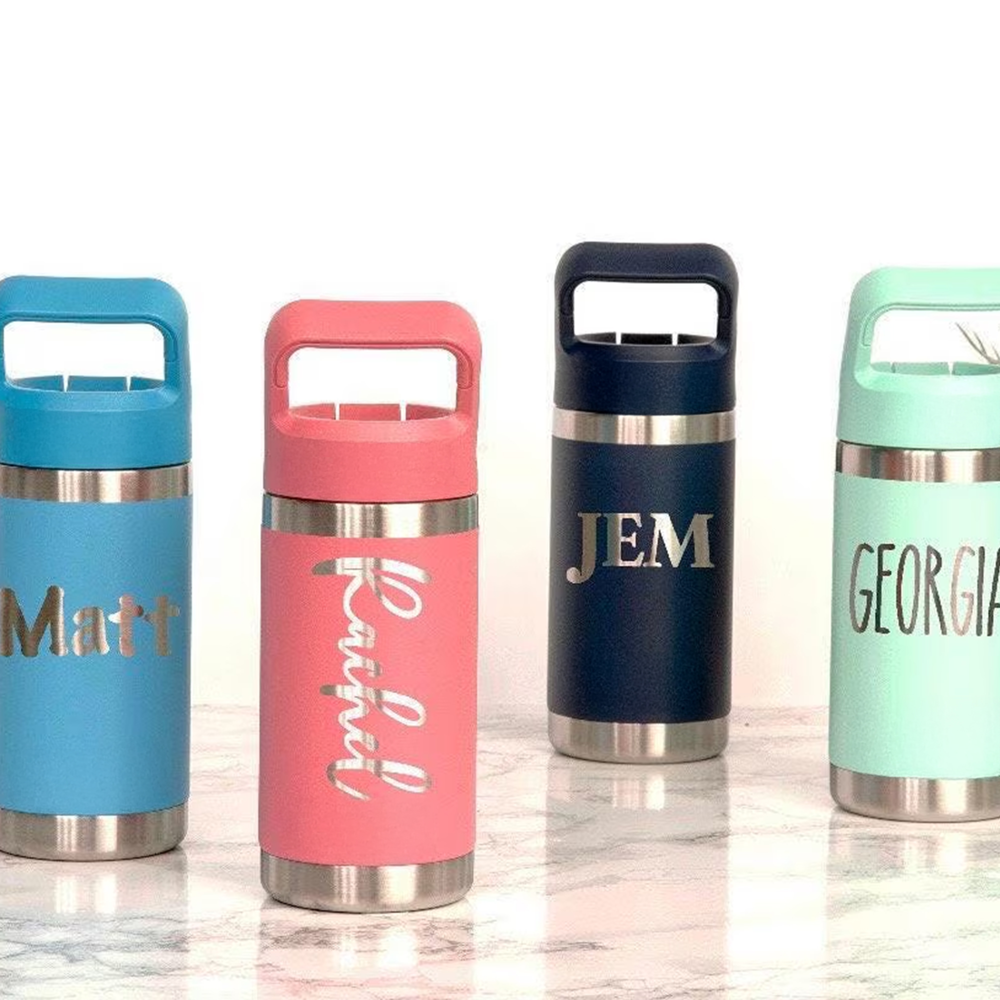 This high-quality, custom-engraved water bottle is sure to delight any child you love! It's the perfect gift for a birthday, Christmas, or Easter, and can be used around the house, outdoors, or on the go! The handle is easy for little hands to carry, and the flip-top straw makes it easy to hydrate on the go without spilling! It's also the perfect gift for a special ring boy or flower girl on your special day! With a wide selection of styles and colors, as well as even more fonts and designs, we're sure you can create a perfect bottle with an engraving that will last a lifetime!