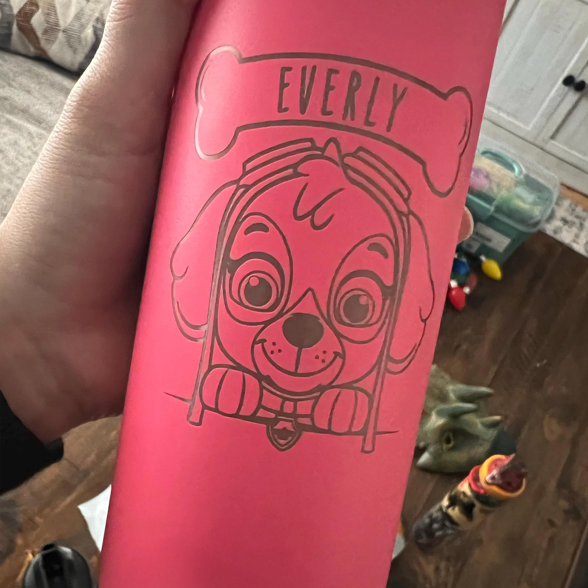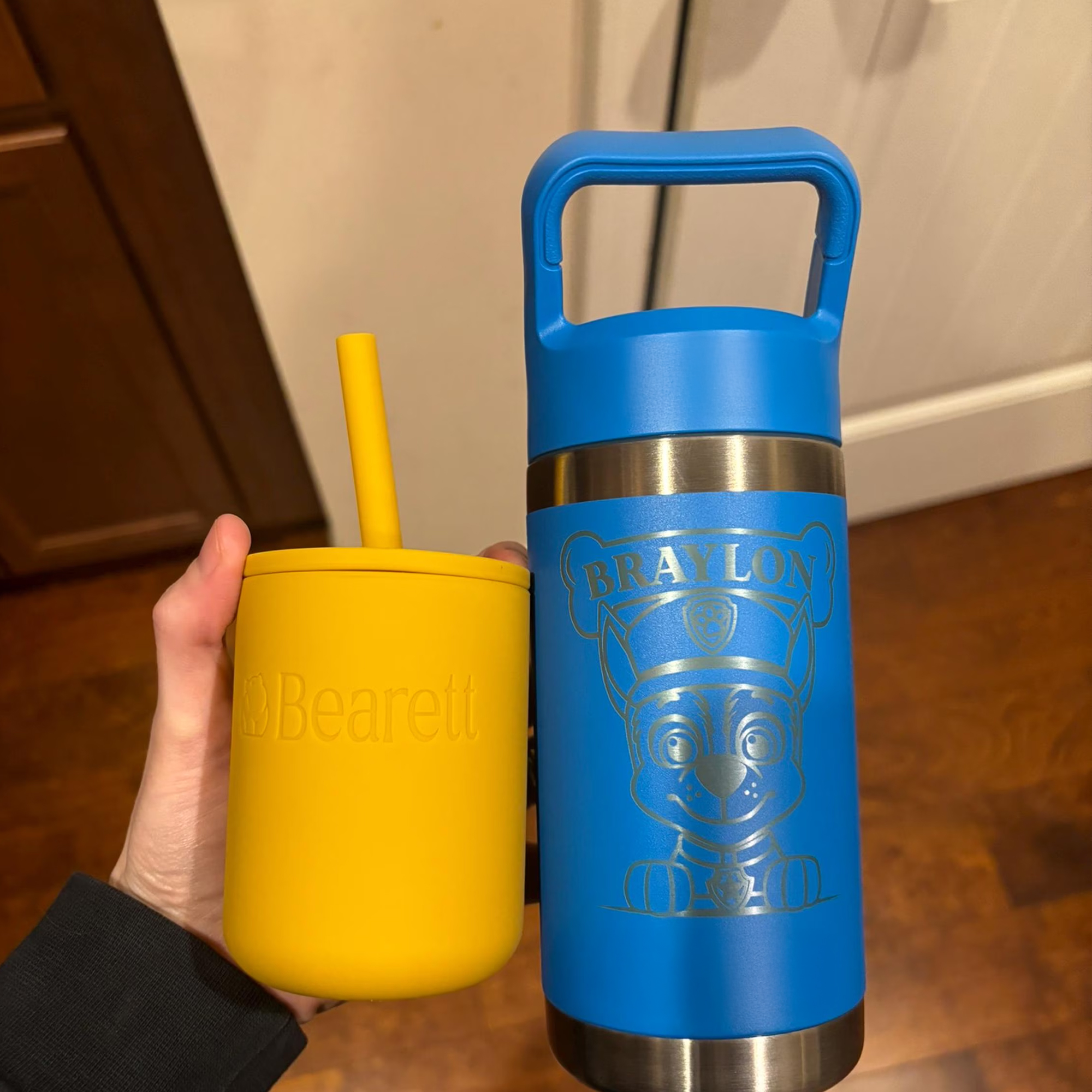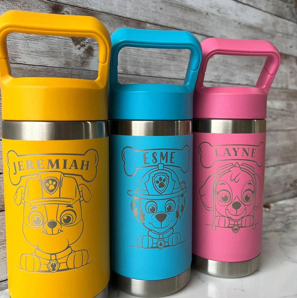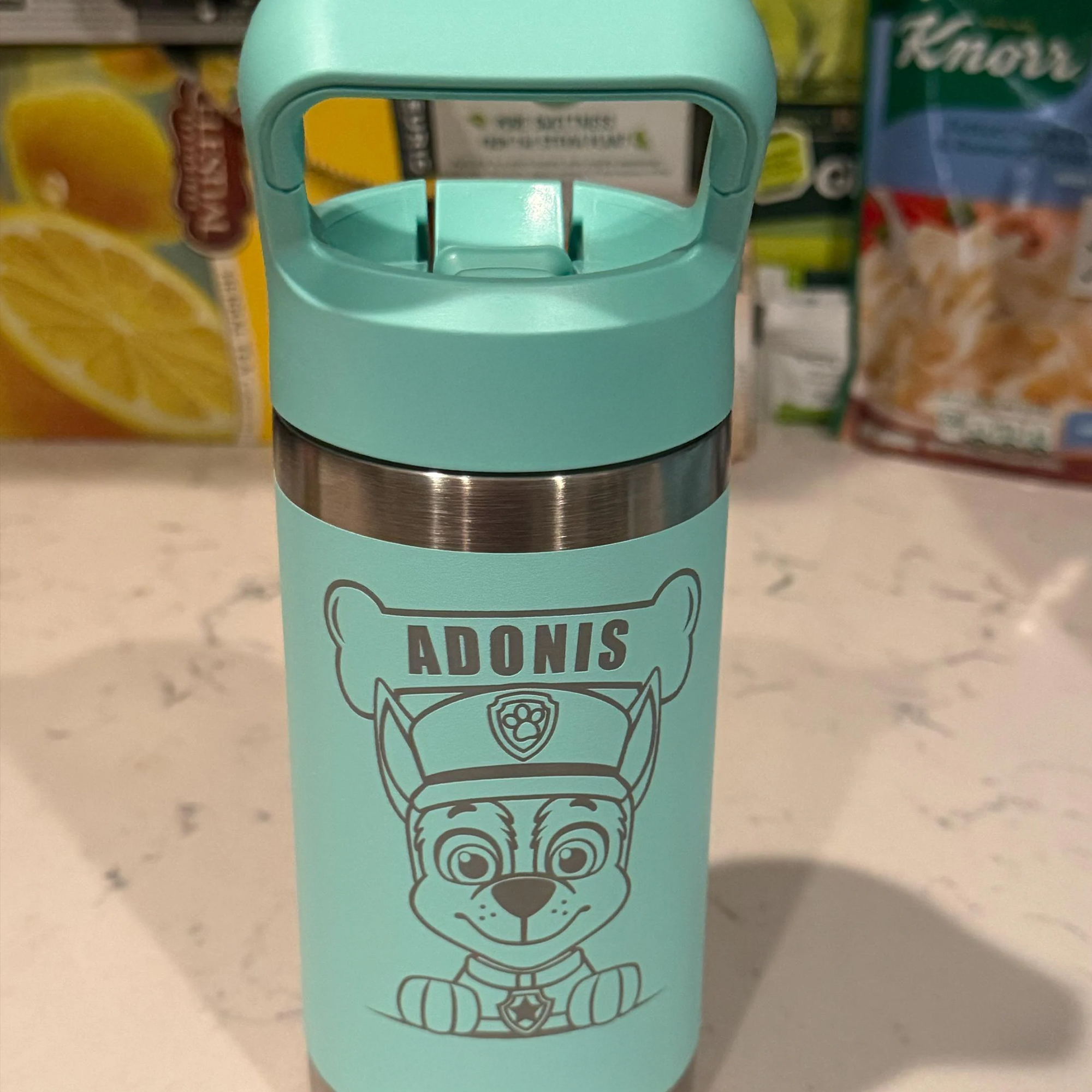 This high-quality, custom-engraved water bottle is sure to delight any child you love! It's the perfect gift for a birthday, Christmas, or Easter, and can be used around the house, outdoors, or on the go! The handle is easy for little hands to carry, and the flip-top straw makes it easy to hydrate on the go without spilling! It's also the perfect gift for a special ring boy or flower girl on your special day! With a wide selection of styles and colors, as well as even more fonts and designs, we're sure you can create a perfect bottle with an engraving that will last a lifetime!